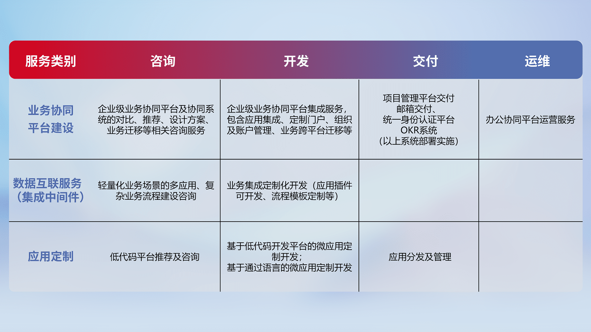 针对钉钉、、、企微、、、IDaas等平台级产品提供产品的规划、、、方案、、交付、、、定制化开发等服务,,实现如统一协同办公、、、、智能客户服务、、、混合会议管理、、、、智能数据查询、、、、等业务场景,,,实现数字化转型。。。。